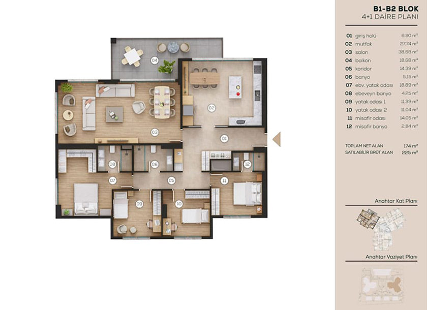 Located in the dynamic district of Başakşehir, Istanbul, this exclusive residential project offers a prime location near the Medical City and Kayaşehir Square, with easy access to the nearby metro station. Spread over 10,133 square meters, the project comprises 52 private apartments and 4 luxurious villas. With 3 blocks, each standing 6 floors high, residents can choose from a variety of spacious apartment types, including 3+1, 4+1, 5+1, and 6+2 villa layouts. The project promises a premium lifestyle with modern design, set for delivery on 30/04/2025.