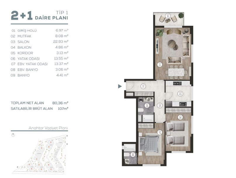 This modern apartment project is located in the rapidly developing district of Başakşehir, just steps away from the Medical City and Kayaşehir Square, offering unmatched convenience and accessibility. Spread over a land area of 10,507 square meters, the project consists of 9 blocks, each with 6 floors, and features 128 private apartments designed in 2+1 layouts. With a planned delivery date of 31/12/2025, this project provides a comfortable and contemporary living experience, ideal for families and professionals seeking a well-connected and vibrant community.